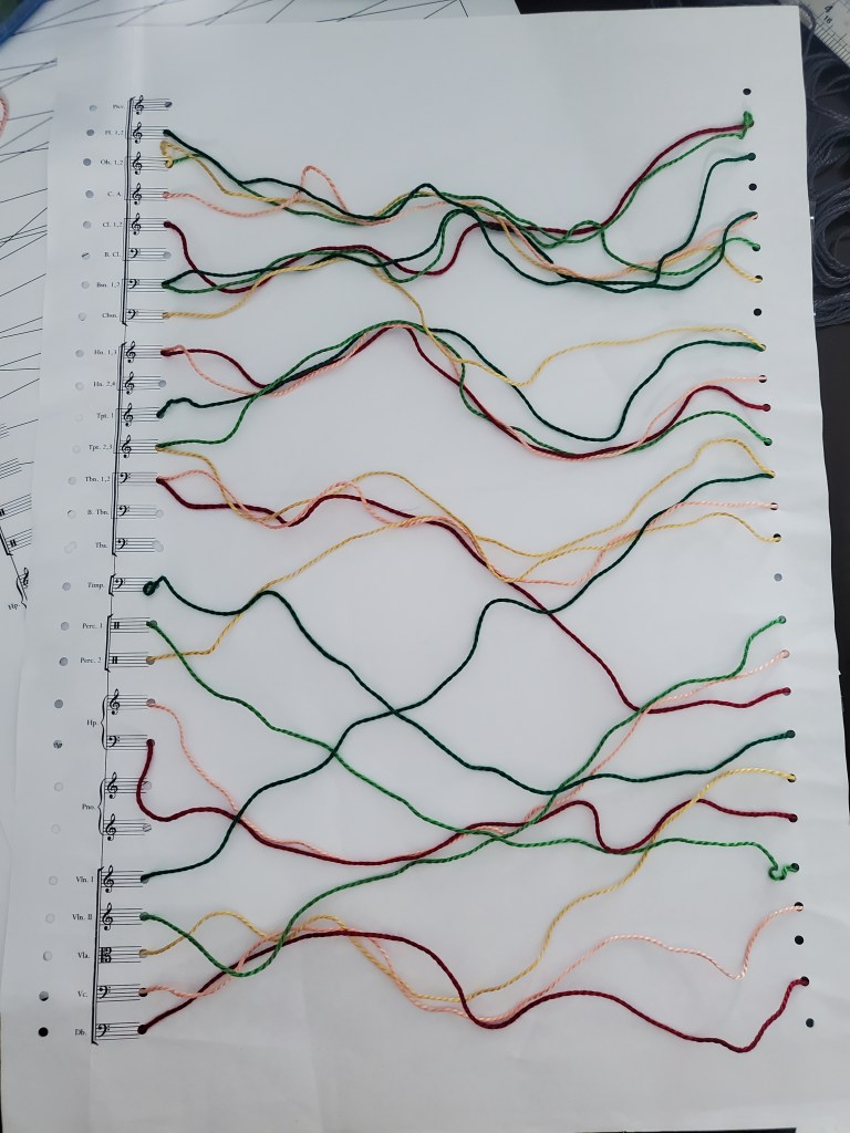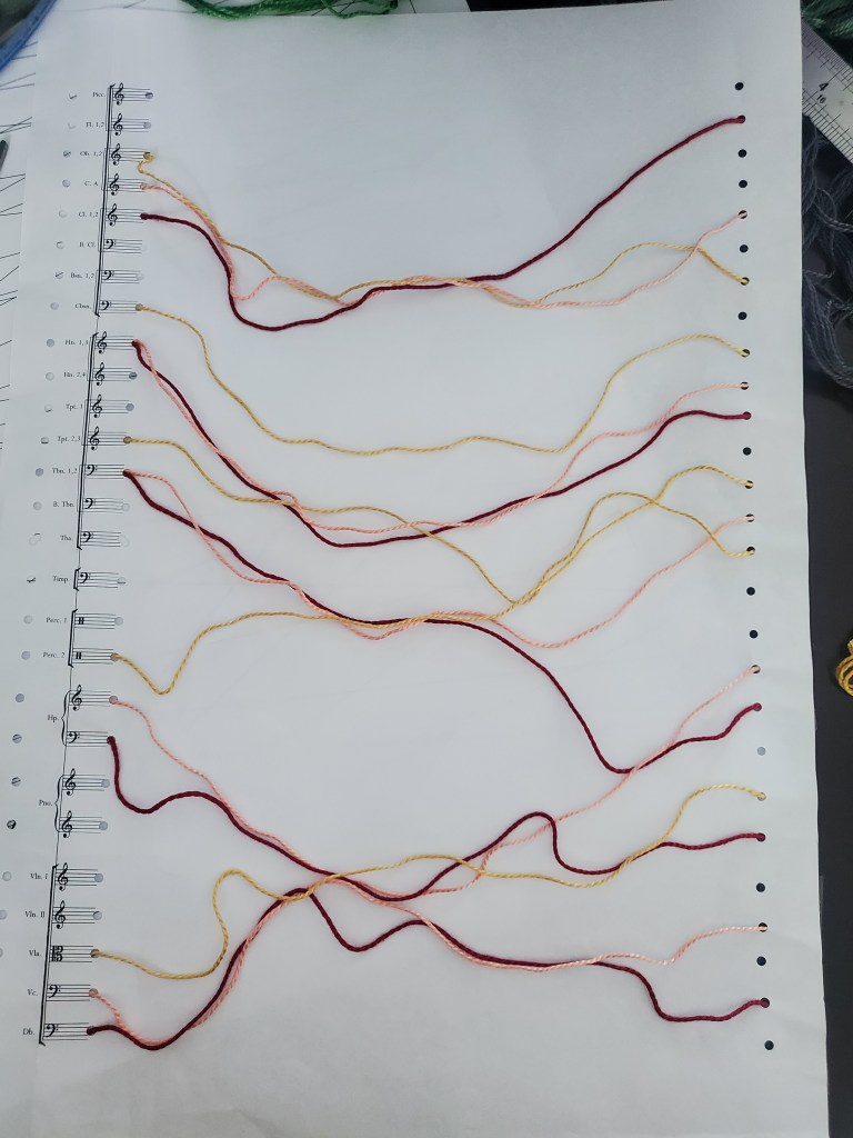 The work takes inspiration from the story of Arachne in Ovid’s Metamorphoses (Book 6), a tale of a weaving duel between skillful mortal (Arachne) and proud goddess (Minerva). It is a minimalist and texture-driven work meditating on rhythms and processes in the textile art of weaving. The work is framed around the two artistic weaves produced by each of the women. The first main section, “Minerva’s Weave: Audacity,” unfolds musicially as a representation of the stories Minerva selects to weave, scenes of mortal pride ending with disaster or downfall, sending a message to the proud but capable Arachne. Musically, the orchestra undulates line by line, thread by thread, only comprehending the full image much later in the process, when the evolving melody is played in full by the violas.